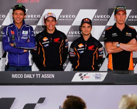 La tappa olandese del Motmondiale si apre con la consueta conferenza stampa alla quale oggi, alle ore 17:00, hanno partecipato Marquez, Rossi, Pedrosa, Dovizioso, Aleix Espargarò e Bradl. Il primo a prendere la parola è stato il leader del mondiale che ha individuato in Assen una pista che si adatta maggiormente alle Yamaha: